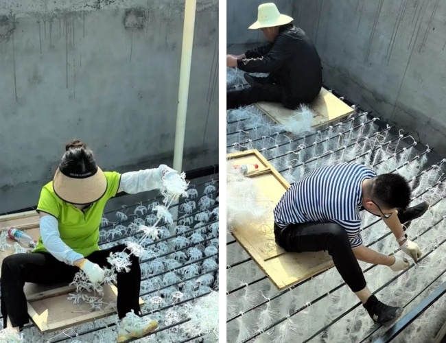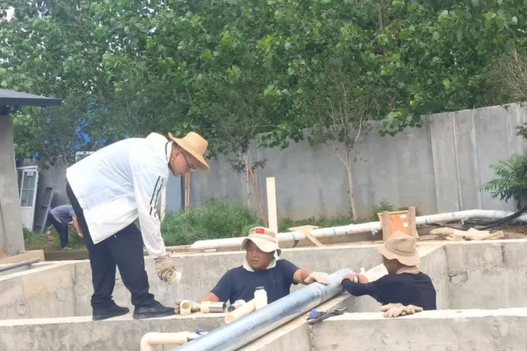 填料綁扎完成后,工程部便進入了最后的沖刺。他們在池內(nèi)池外鋪設(shè)水管、連接電線,讓設(shè)備真正“活”起來。