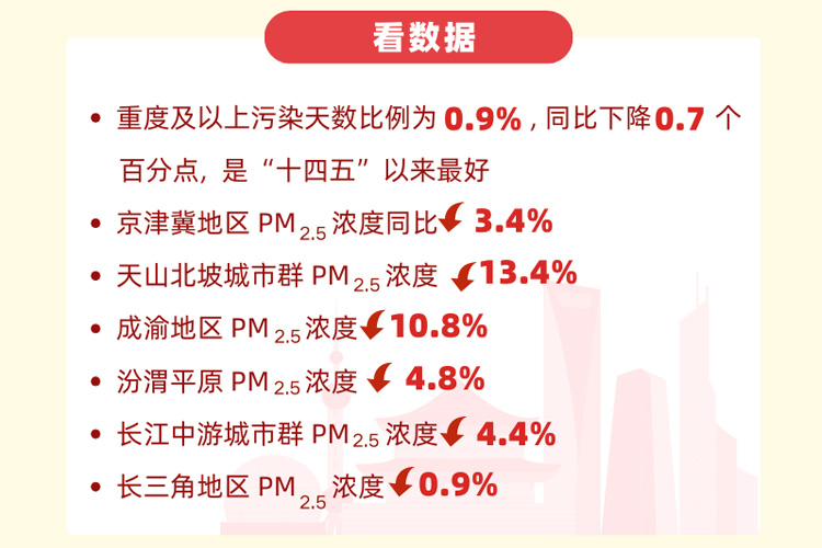 2025年政府工作報(bào)告指出,2024年生態(tài)環(huán)境質(zhì)量有新改善,地級(jí)及以上城市細(xì)顆粒物(PM2.5)濃度下降2.7%,優(yōu)良天數(shù)比例上升至87.2%。