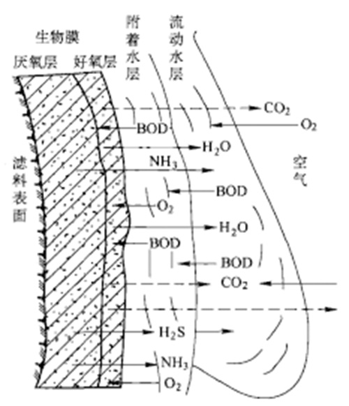 由于生物膜的吸附作用,在膜的表面存在一個(gè)很薄的附著水層。污水流過生物膜時(shí),有機(jī)物經(jīng)附著水層向膜內(nèi)擴(kuò)散。膜內(nèi)微生物在氧的參與下,對有機(jī)物進(jìn)行分解和機(jī)體新陳代謝。代謝產(chǎn)物沿底物相反的方向擴(kuò)散,從生物膜傳遞返回液相和空氣中。在整個(gè)生物膜系統(tǒng)中,微生物不斷吸收有機(jī)營養(yǎng)成分,污水不斷得到凈化,而生物膜也不斷生長,一些老化的生物膜會(huì)自動(dòng)脫落,從而保持了生物膜的良好活性。