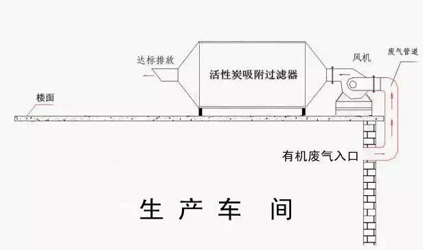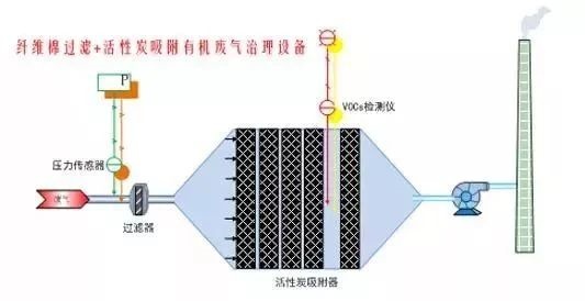 車(chē)間有機(jī)廢氣通過(guò)吸氣罩收集,在排風(fēng)機(jī)作用下,經(jīng)過(guò)管道輸送進(jìn)入干式過(guò)濾器,再進(jìn)入活性炭吸附裝置,有機(jī)污染物被活性炭吸附,凈化后的氣體經(jīng)風(fēng)機(jī)增壓后達(dá)標(biāo)排放;钚蕴课斤柡秃,請(qǐng)專(zhuān)業(yè)廠家再生后回用。